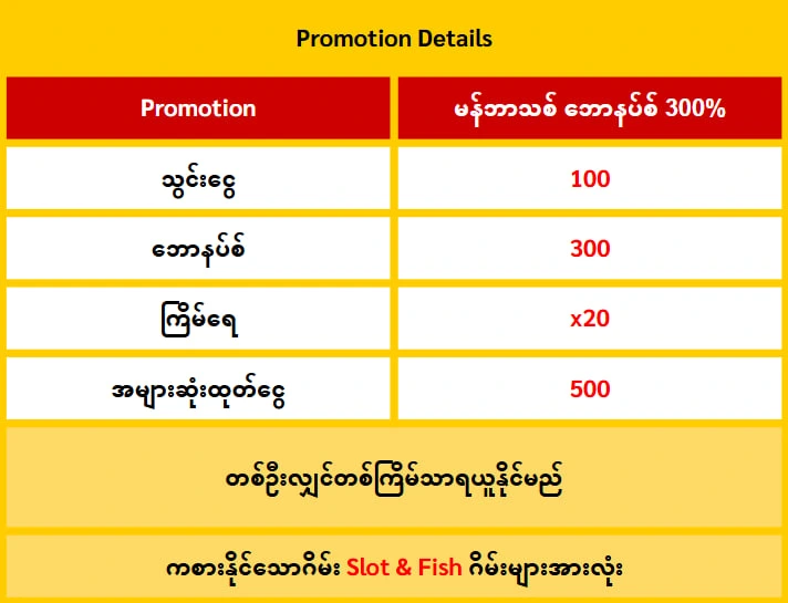 3.သြင္းေငြ 10,000 က်ပ္ ေဘာနပ္ 30,000 က်ပ္ ႀကိမ္ေရ 20 ဆ ထုတ္ေငြ အမ်ားဆုံး 50,000 က်ပ္ထိ ထုတ္ႏိုင္ပါသည္။