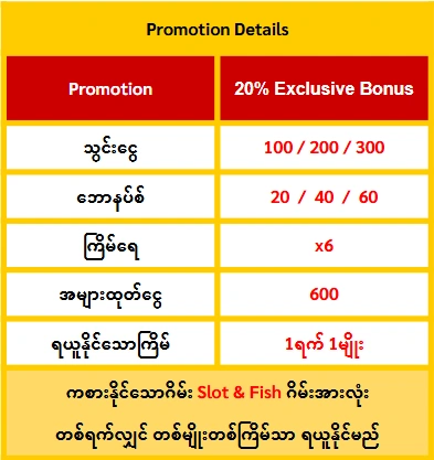 2.သြင္းေငြ 10,000/20,000/30,000 က်ပ္ ေဘာနပ္ 2,000/4,000/6,000 က်ပ္ ႀကိမ္ေရ 6 ဆ ထုတ္ေငြ အမ်ားဆုံး 60,000 က်ပ္ထိ ထုတ္ႏိုင္ပါသည္။